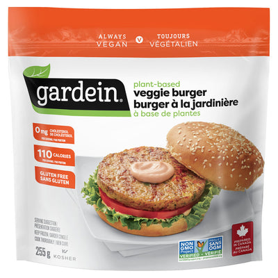Un burger végétarien classique fait avec des ingrédients comme du riz brun, des carottes, des oignons, des poivrons, de l’avoine, des pois et du maïs, le tout assaisonné d’épices. Sans gluten, projet sans OGM vérifié, kascher et préparé au Canada.